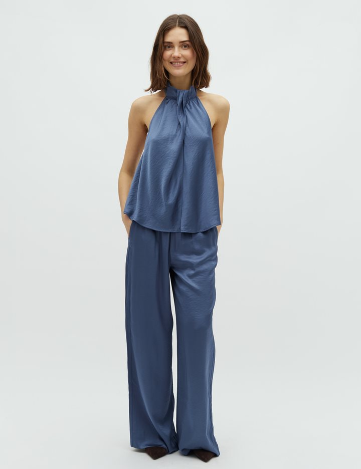 Satin pants with side pockets.- Material: 54% Polyester, 46% Viscose- Wide legs- Side pockets- Elasticated waist- Satin qualityThe height of the model is 175 cm and she is wearing a size S.