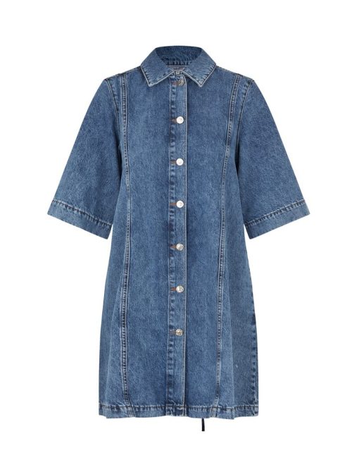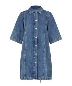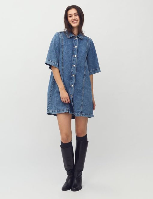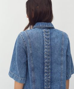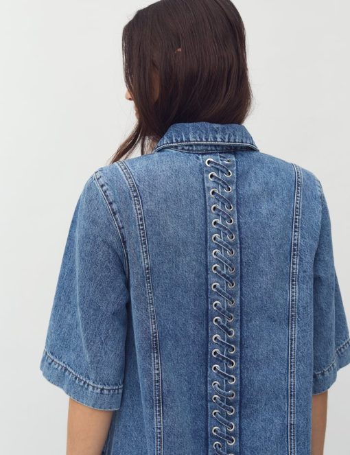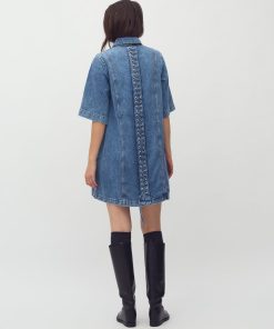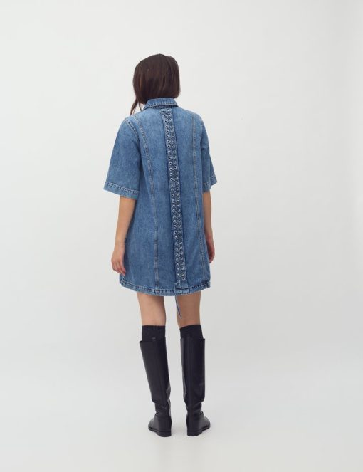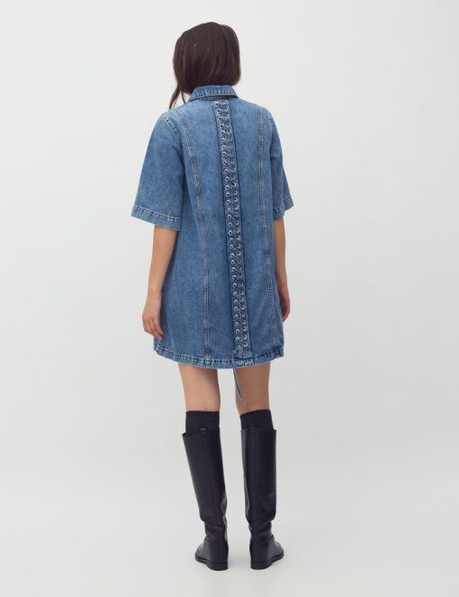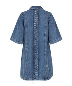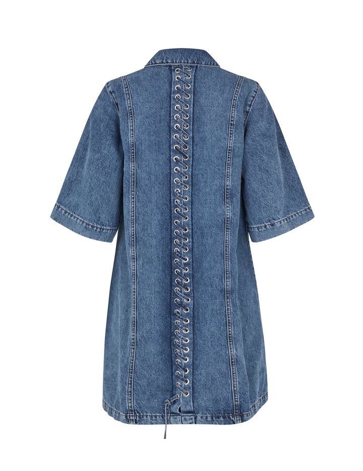 Denim dress with buttons and lace details.- Material: 100% Cotton- Short, wide sleeves- Mini length- Relaxed fit- Shirt collar- Button closure- Lace details on the backThe model's height is 176 cm and she is wearing a size S.