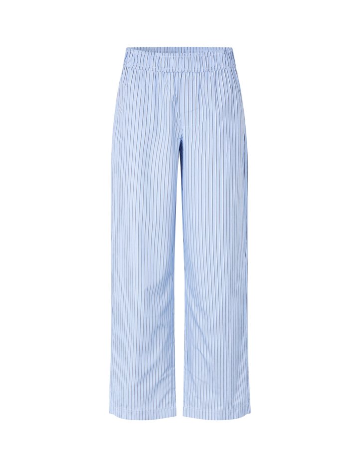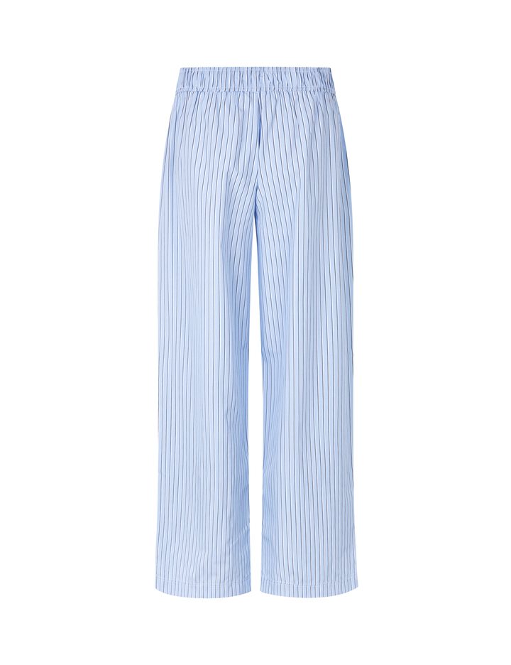 Striped poplin pants.- Material: 65% Polyester, 35% Cotton- Elasticated waist- Side pockets- Straight legs- Color: Blue Navy StripeThe model is 174 cm and wears size S.