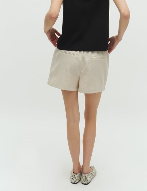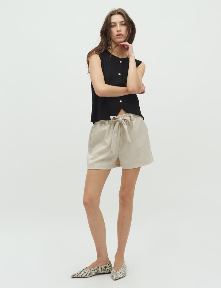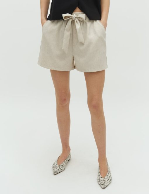Loose shorts with matching belt.- Material: 89% Polyester, 7% Linen, 4% Elastane- Elastic waist- Self-fabric waistband- Belt loops- Loose fitThe model is 176 cm tall and is wearing a size S.