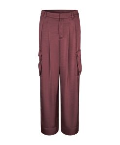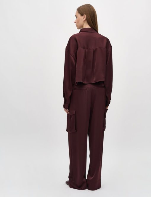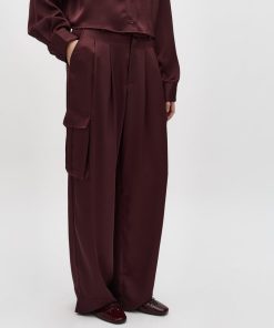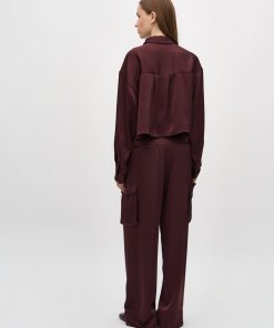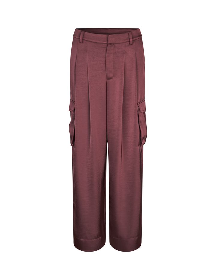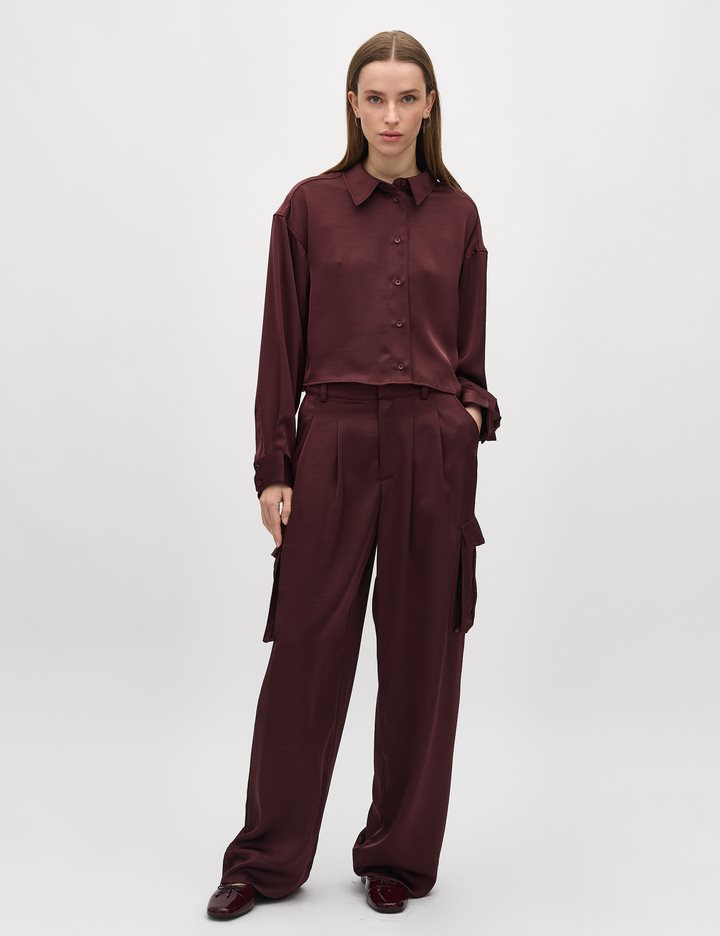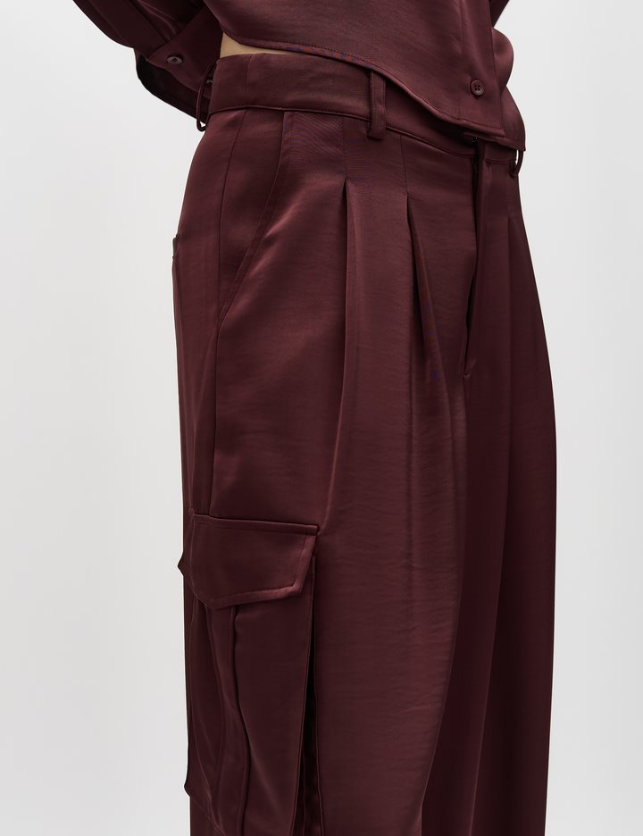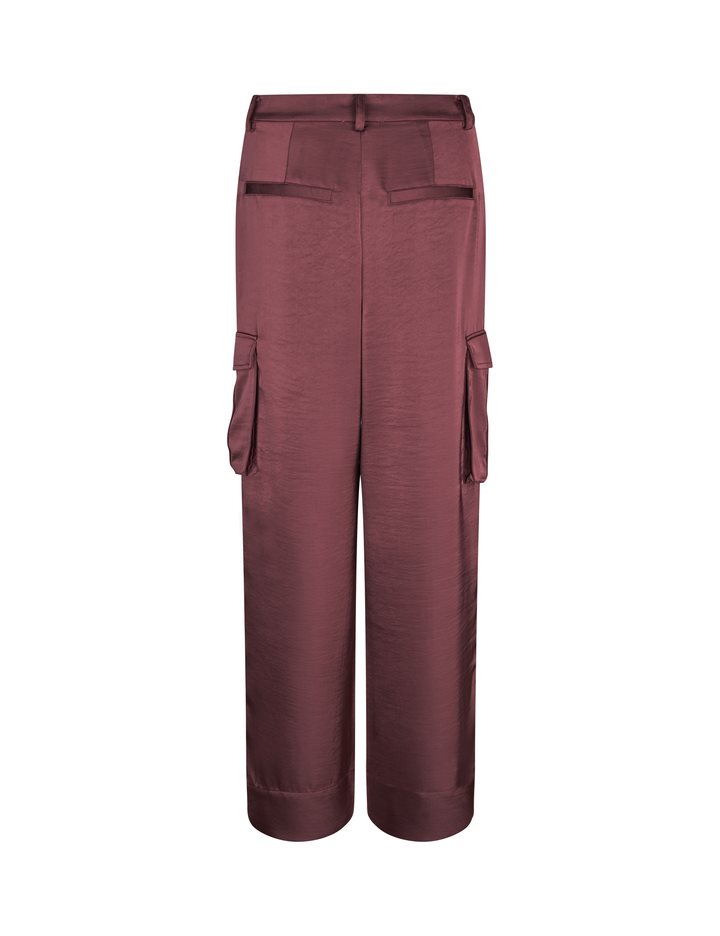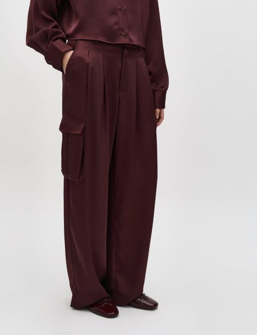 Cargo pants with straight wide legs.- Material: 98% Polyester, 2% Elastane- Button and zip closure- Cargo pockets- Satin quality- Wide, straight legs- Belt straps- Color: BordeauxThe height of the model is 174 cm and she is wearing a size S.