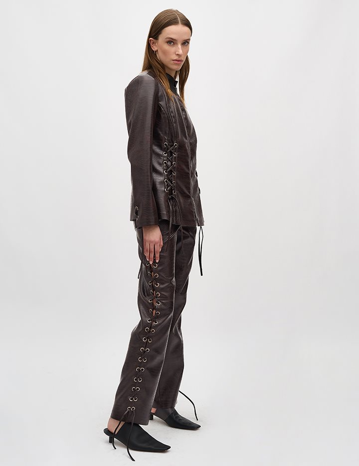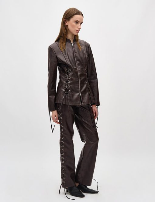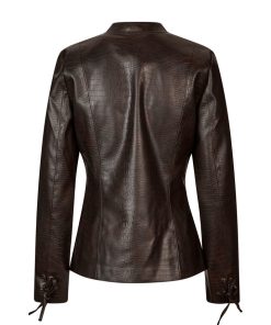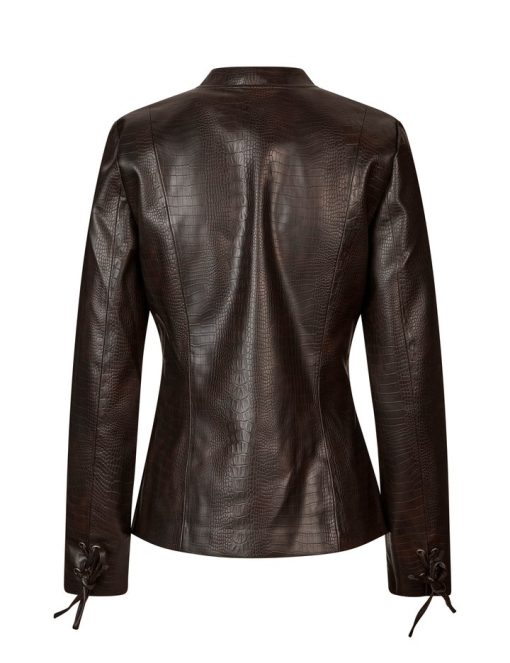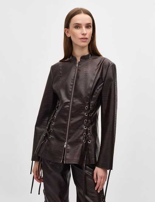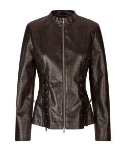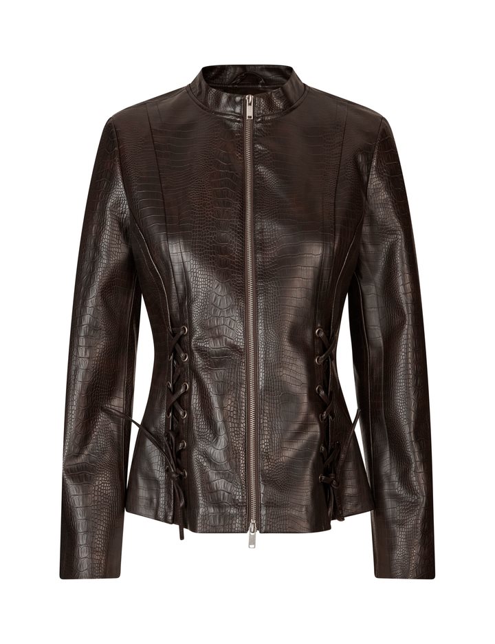 Faux leather jacket with lace detail at the front.- Material: 100% Polyeurethane- Two-way zipper- Lace details- Faux leather- Color: Brown SnakeThe model is 176 cm tall and wears size S