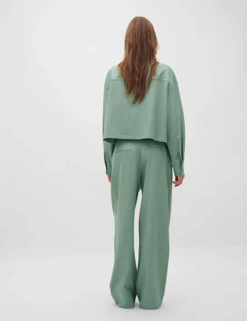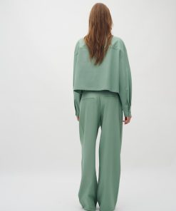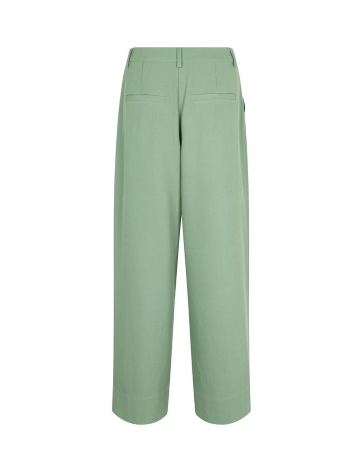 Loose trousers with straight legs.- Material: 97% Polyester, 3% Elastane- Side pockets- Closes with button and zipper- Belt straps- Piped back pockets- Soft and light quality- Relaxed fit- Color: Mineral GreenThe height of the model is 176 cm and she is wearing a size S. She is wearing the matching Alicenna-M blazer.
