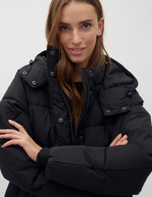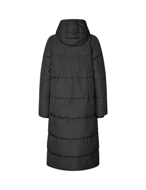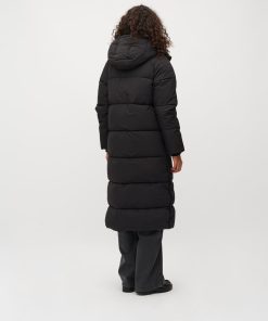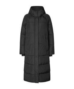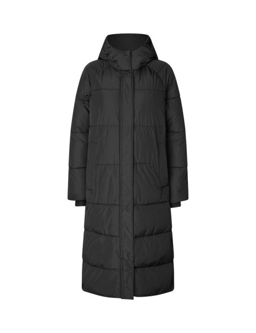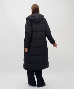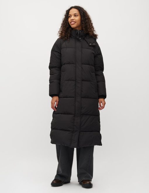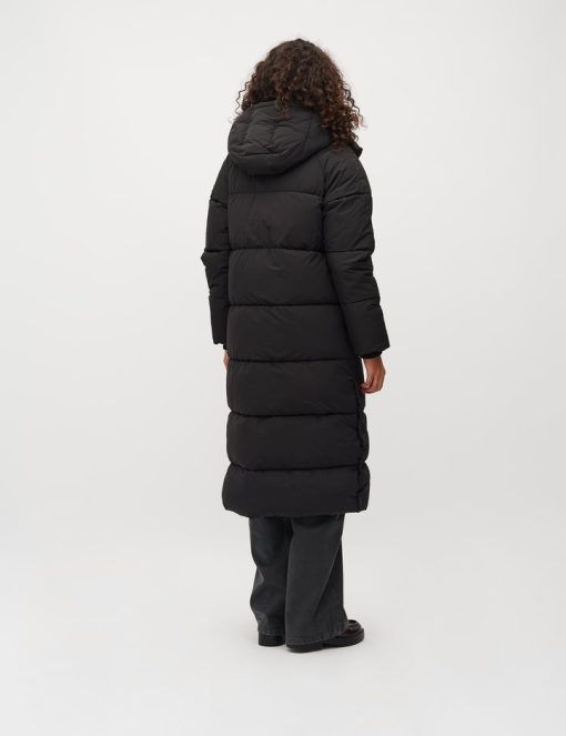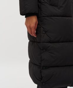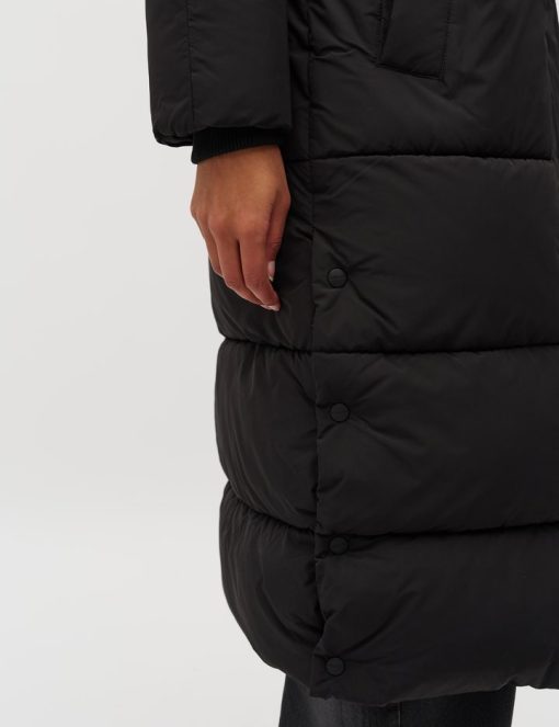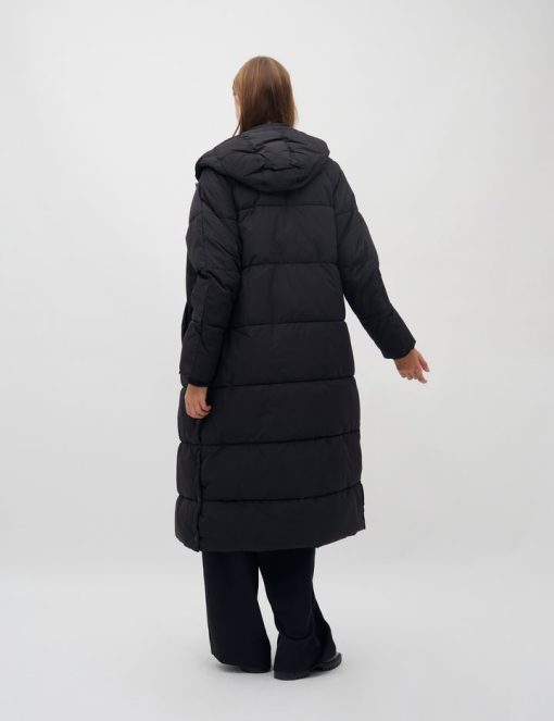 Long puffer jacket with hoodie.- Material:Shell: 100% Recycled Polyester, Lining: 100% Polyester- Long sleeves with concealed elastication at the cuffs- Zip and button closure- Front pockets- Long winter jacket- Hoodie- Stand-up collar- Side slits with button closure- Colour: BlackThe height of the model is 178 cm and she is wearing a size s/m- Chest width: 60 cm in size s/m- Length: 120 cm in size s/m