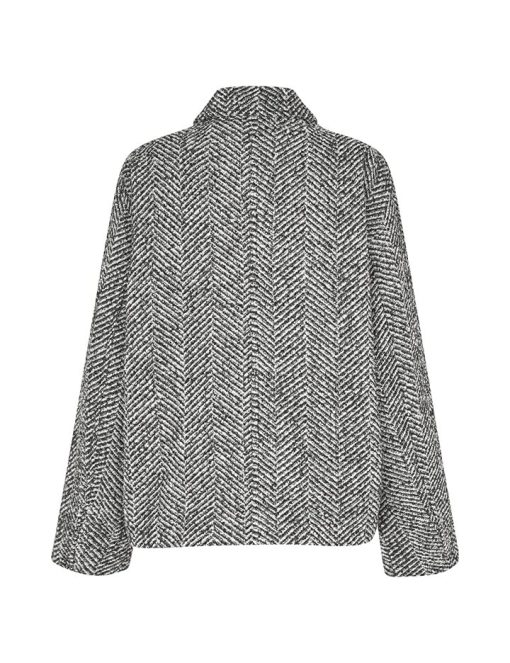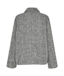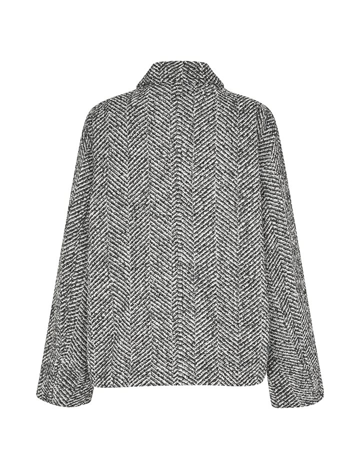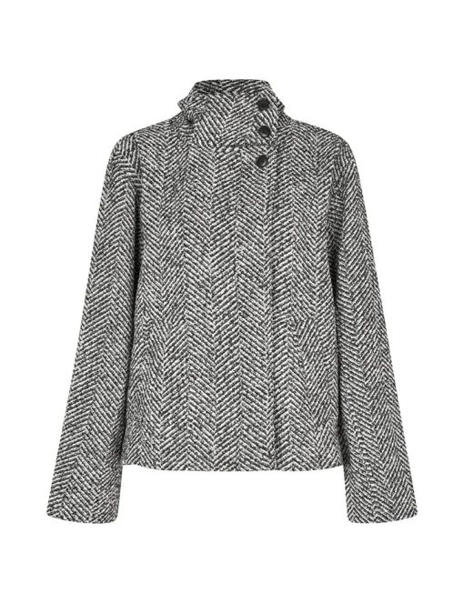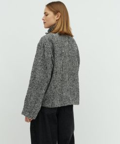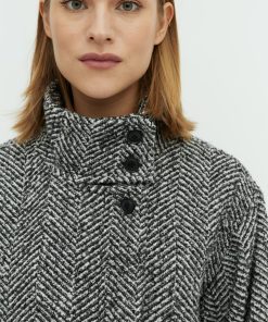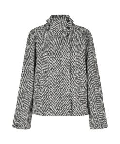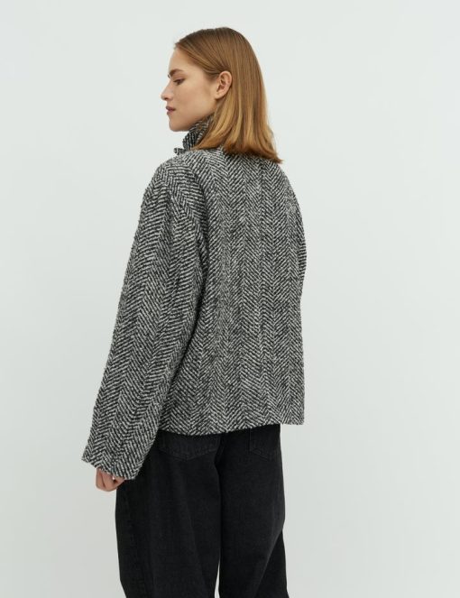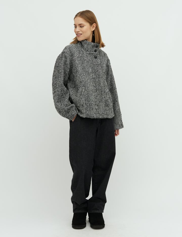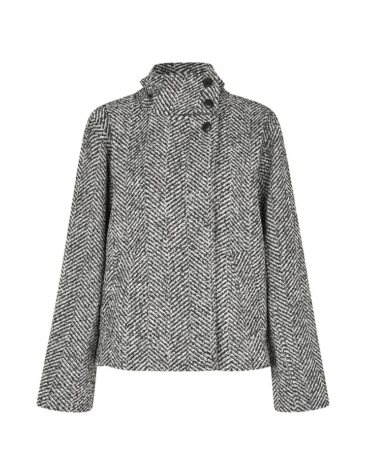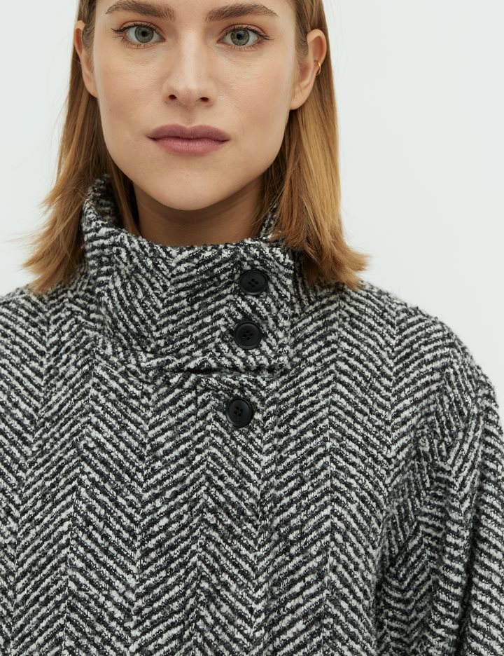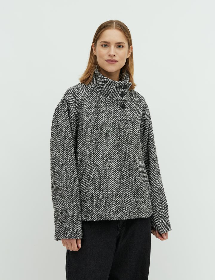 Short jacket with high collar.- Material: Shell; 40% Polyester, 30% Wool, 30% Nylon. Lining; 100% Polyester- Long, wide sleeves- High neck with button details- Loose fit- Length to above the bottom- Slanted side pockets- Closes with concealed buttonsThe height of the model is 175cm and she is wearing a size S.