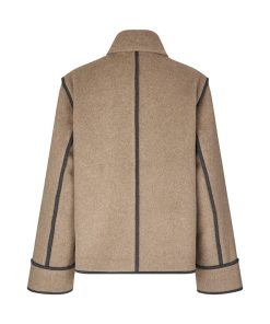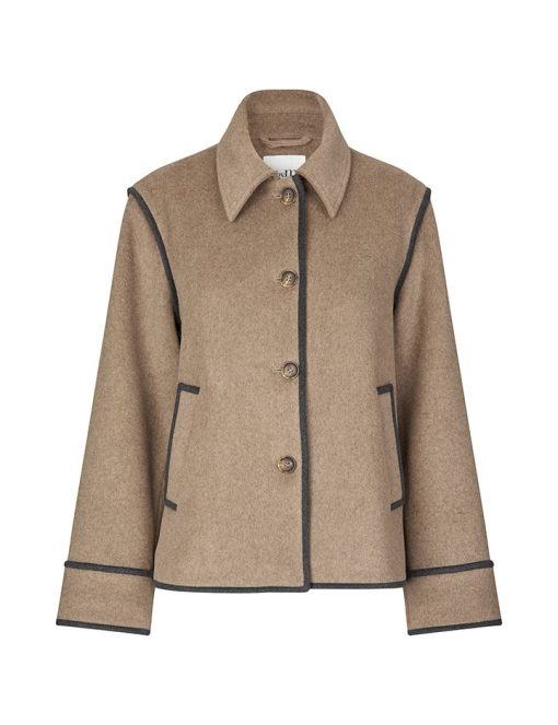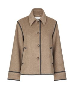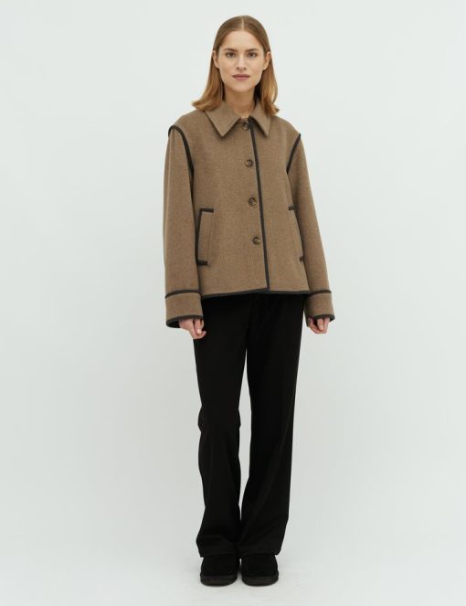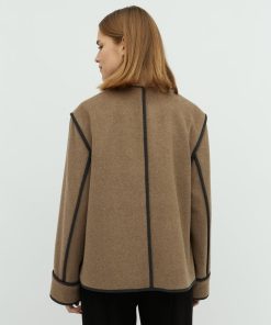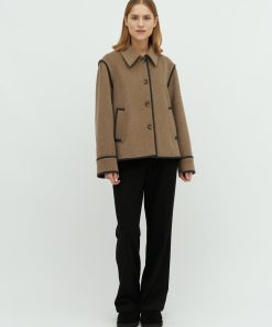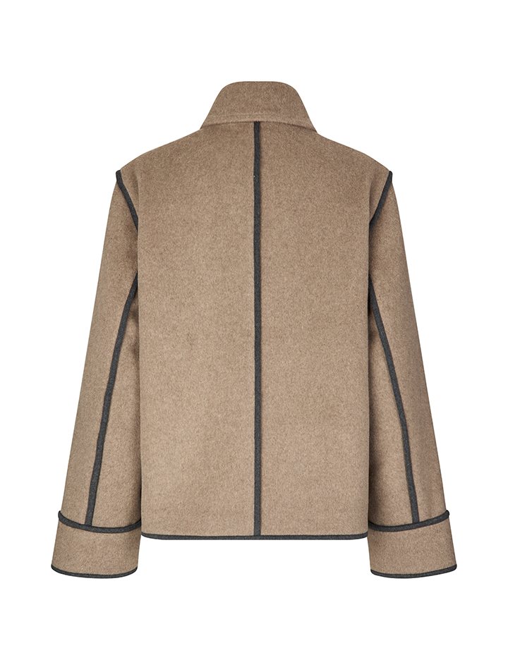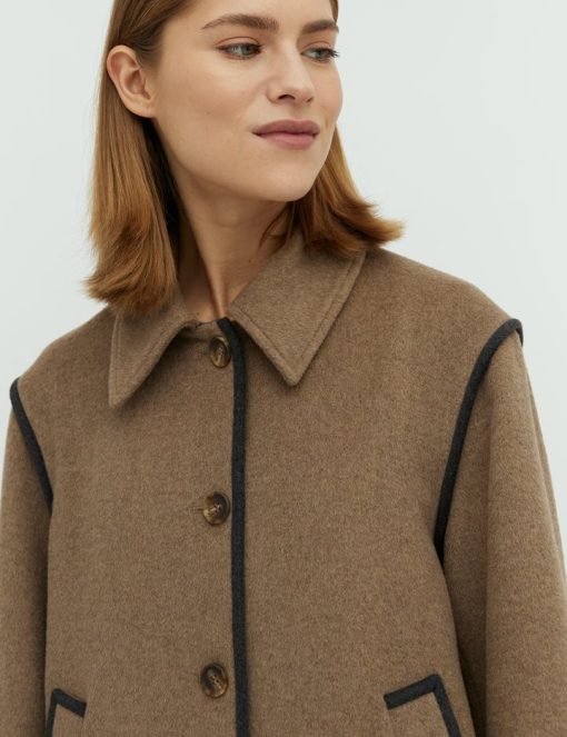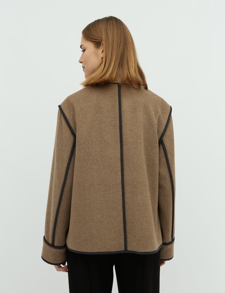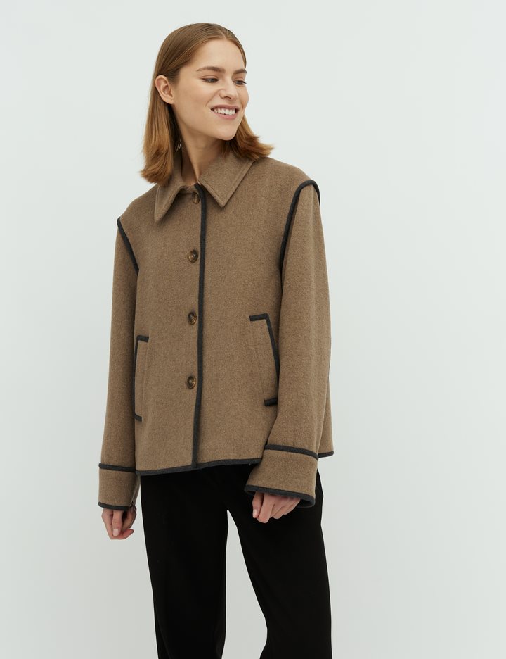 Short wool coat with contrast pipings.- Material; shell; 50% Wool, 45% Polyester, 5% Other Fibers. Waistband: 100% Polyester- Collar- Button closure- Slanted front pockets- Wide sleeves- Relaxed fitThe height of the model is 174 cm and she is wearing a size S.