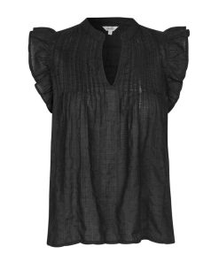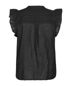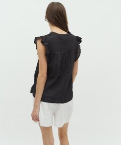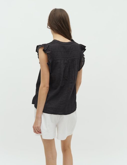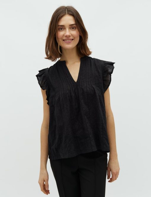 Top with frill details at shoulders.- Material: 100% Cotton- Sleeveless- Round neck with v-neckline- Relaxed fit- Pattern in the fabric- Normal length
