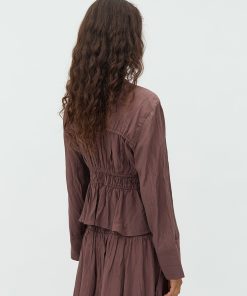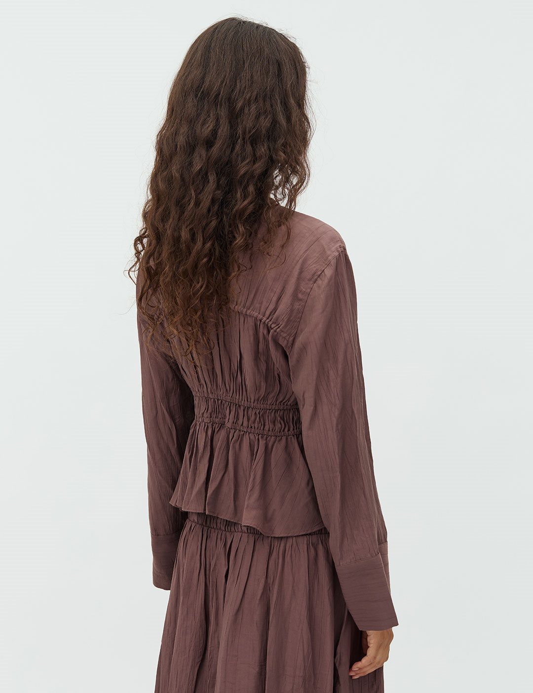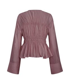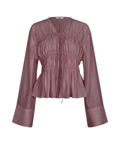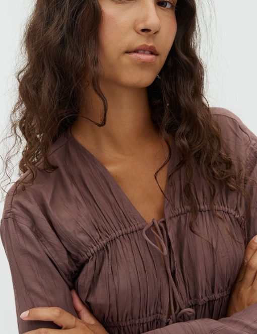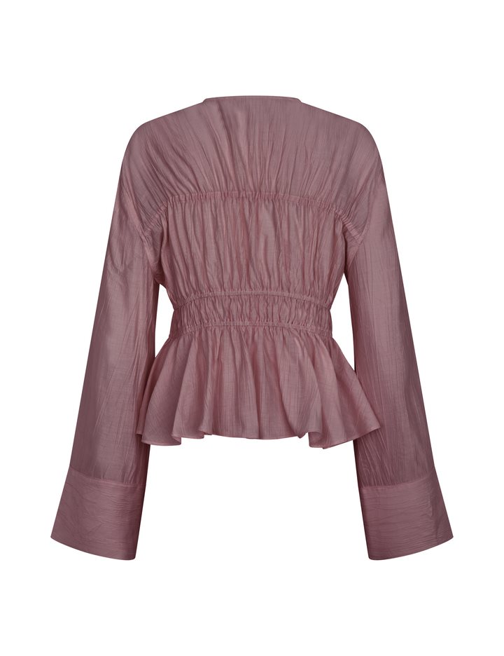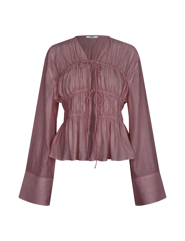 Smocked blouse- Material: 83% Viscose, 17% Nylon- Smocked front- Drawstring closure- V-neck- Long wide sleeves