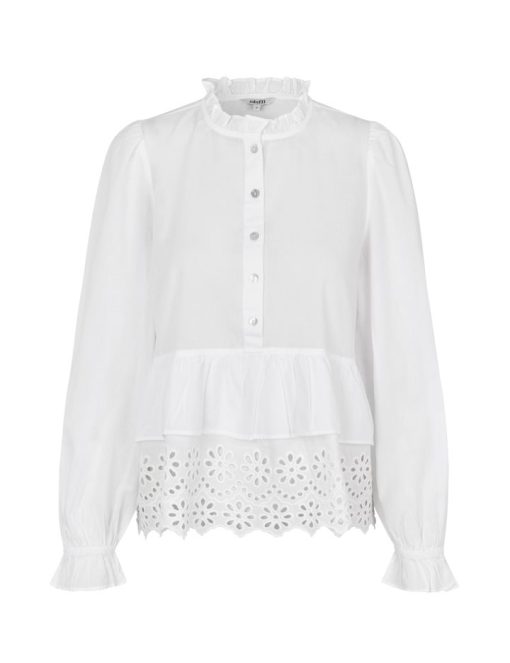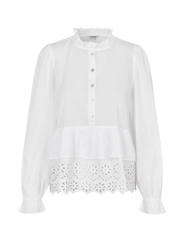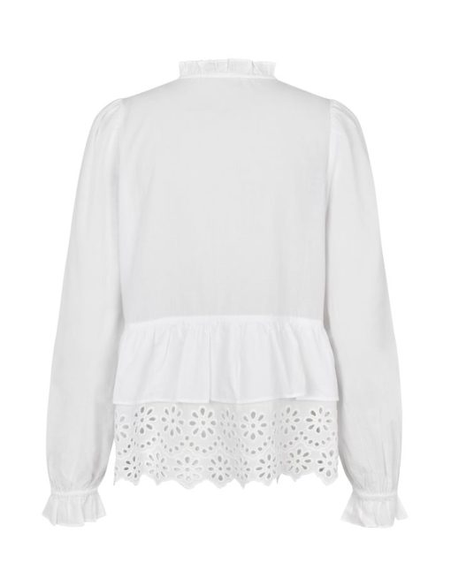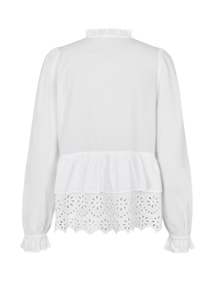 Shirt with lace- Material: 100% Cotton- Peplum- Closes with buttons- High neck with frill- Embroidery anglaise- Wide sleeves- Color: White