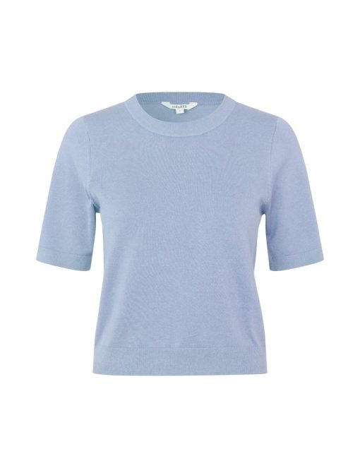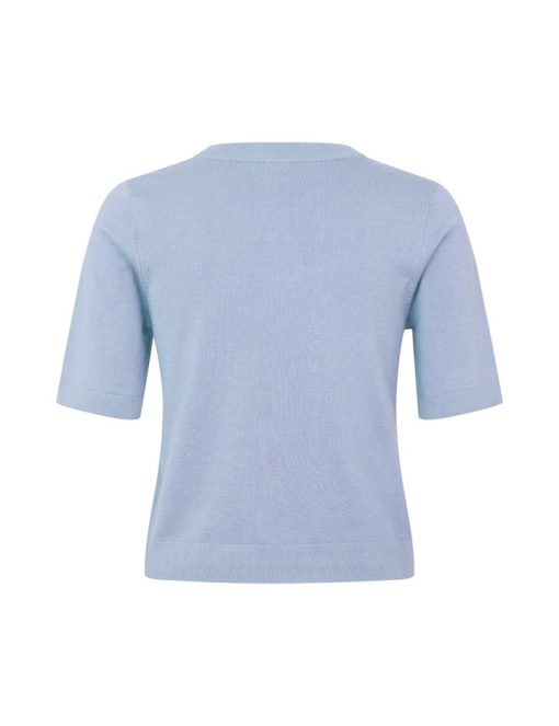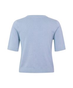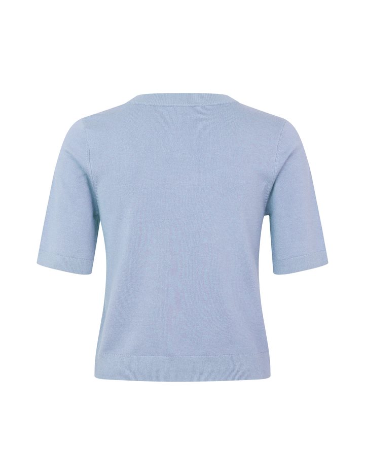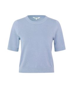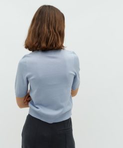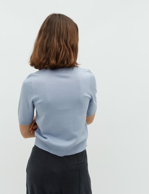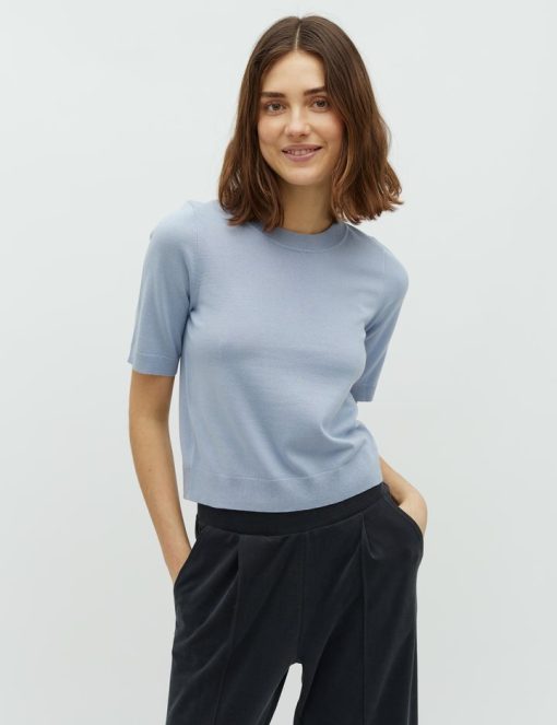 Thin knit sweater with short sleeves.- Material: 70% Viscose, 30% Polyester- Round neck- Normal length- Relaxed fit- Short sleeves with ribbed trim- Ribbed hems- Color: Steel BlueThe height of the model is 175 cm and she is wearing a size S.