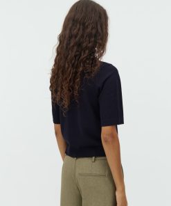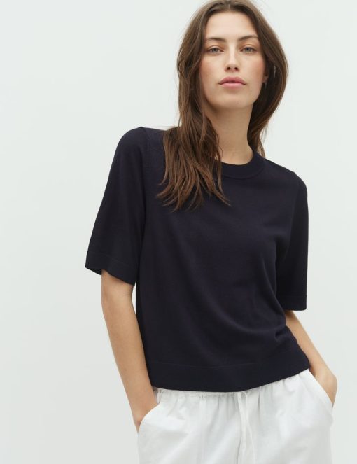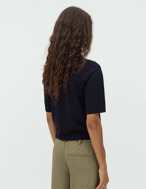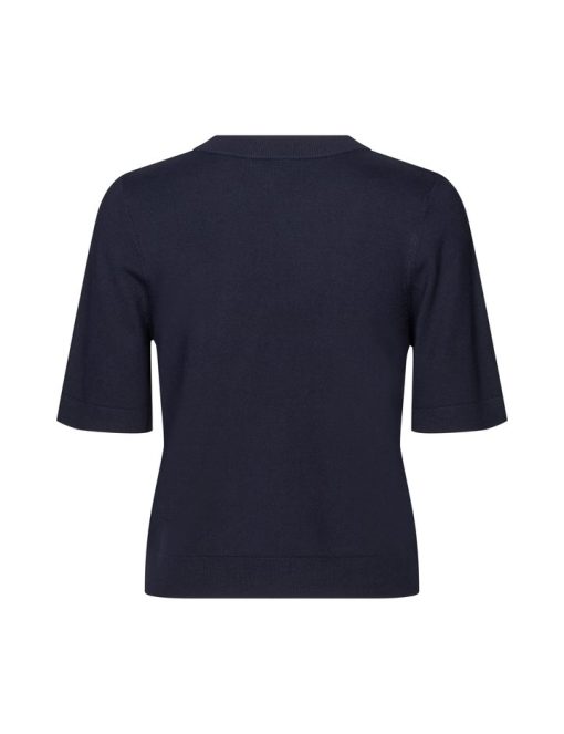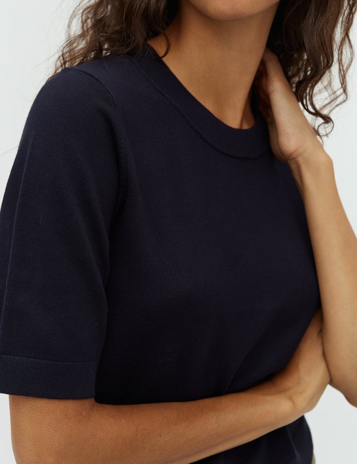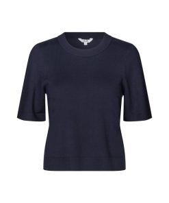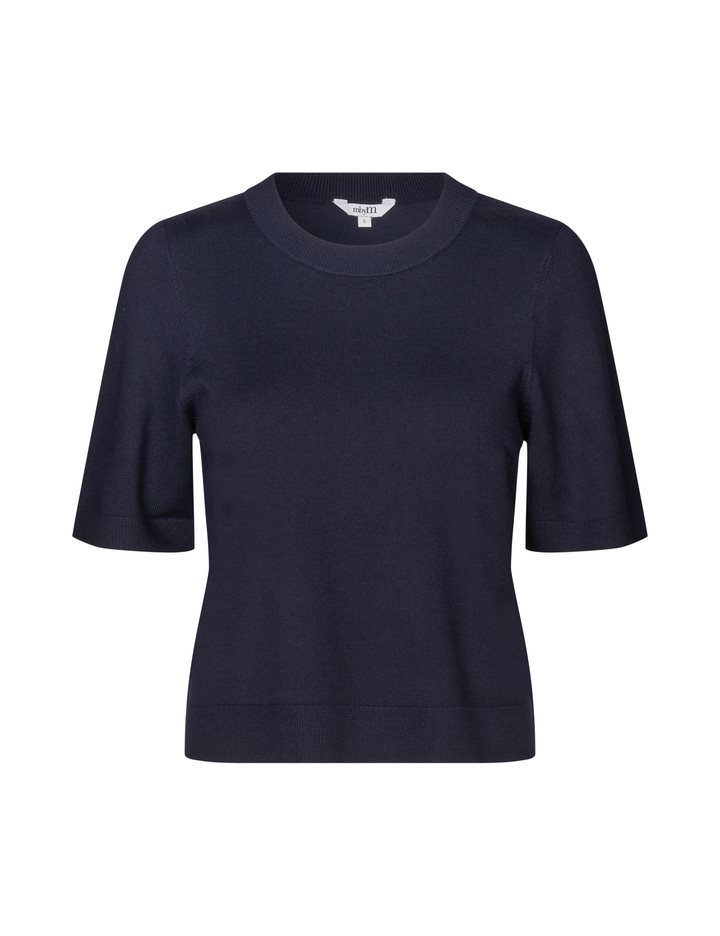 Thin knit sweater with short sleeves.- Material: 70% Viscose, 30% Polyester- Round neck- Normal length- Relaxed fit- Short sleeves with ribbed trim- Ribbed hems- Color: Night Sky
