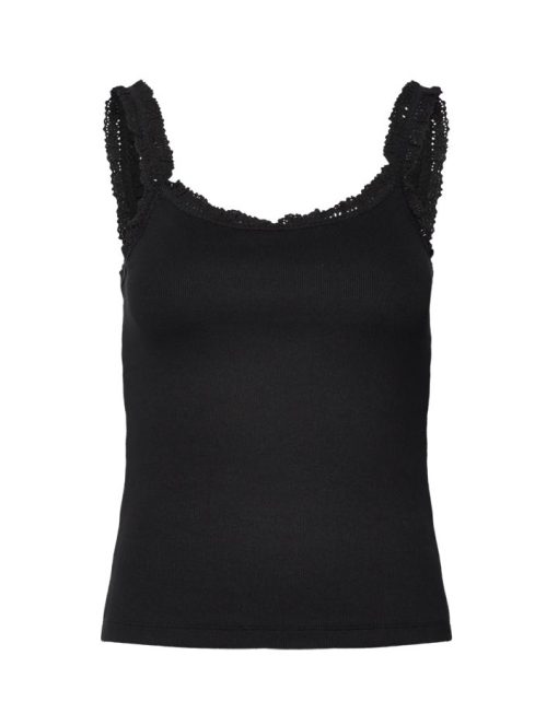 Basic top with ruffled hem.- Material 95% Cotton, 5% Polyester- Soft quality- Details on straps- Tight fitting- Color: BlackThe height of the model is 172 cm and she is wearing a size S.