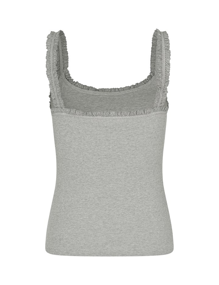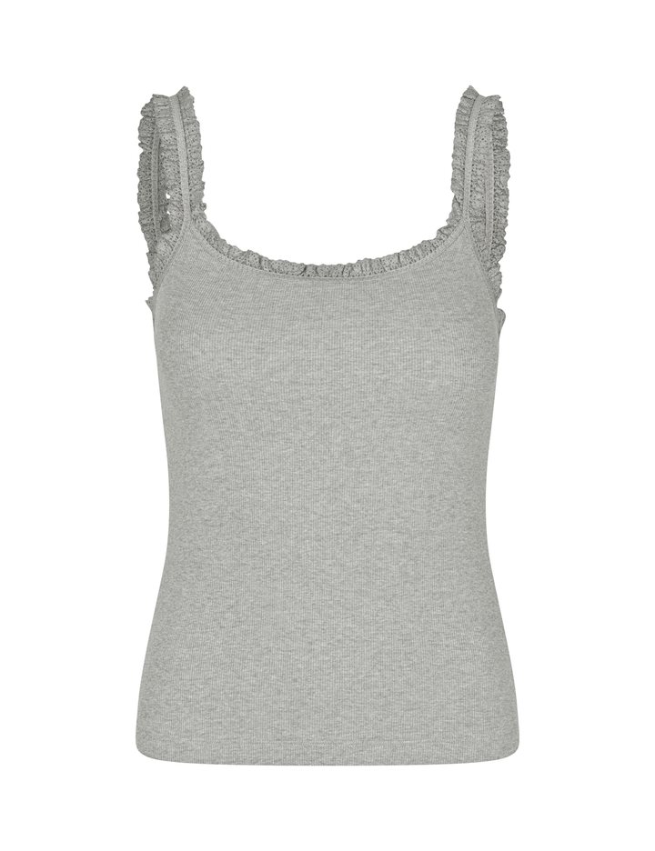 Basic top with ruffled hem.- Material 95% Cotton, 5% Polyester- Soft quality- Details on straps- Tight fit- Color: Grey MelangeThe height of the model is 175 cm and she is wearing a size S.