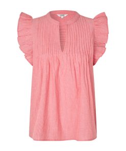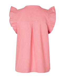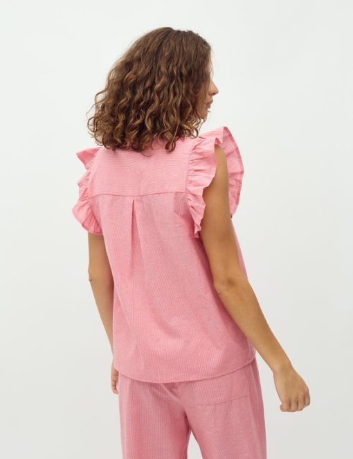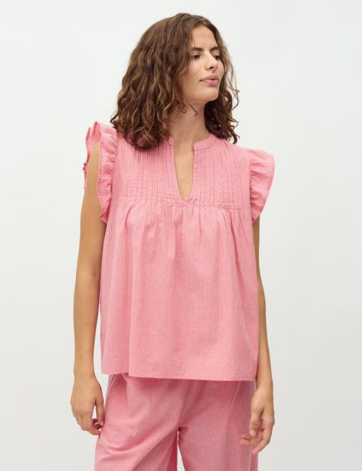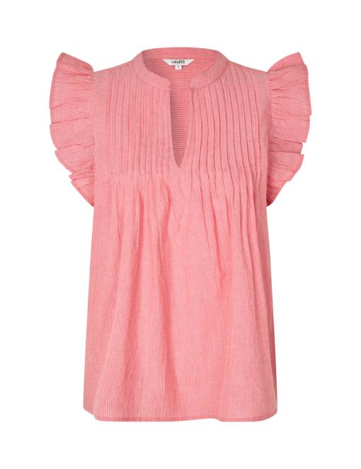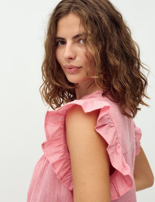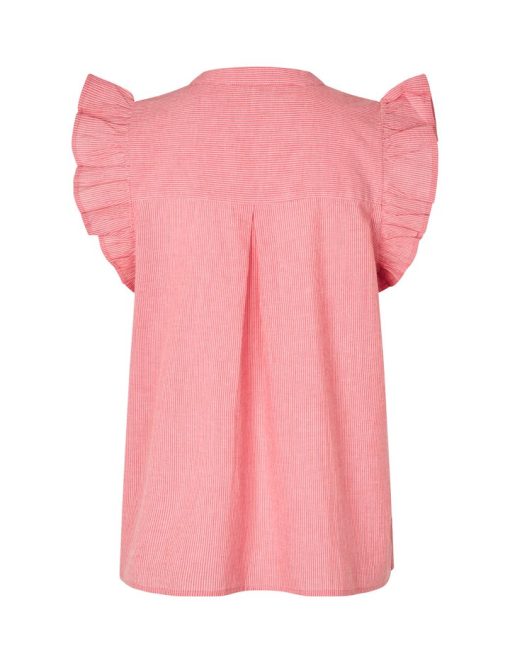 Top with frill details at shoulders.- Material: 100% Cotton- Sleeveless- Round neck with v-neckline- Relaxed fit- Pattern in the fabric- Normal length- Pink Red StripeThe height of the model is 176 cm and she is wearing a size S.