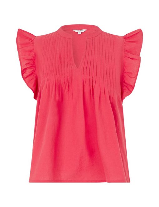 Top with ruffle details at the shoulders.- Material: 100% Cotton- Sleeveless- Round neck with v-neck- Relaxed fit- Pattern in the fabric- Normal length