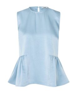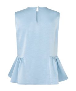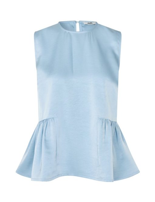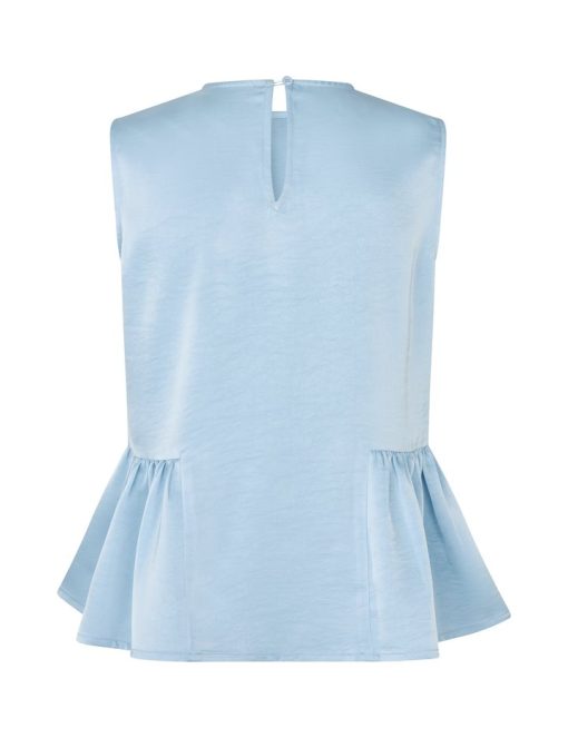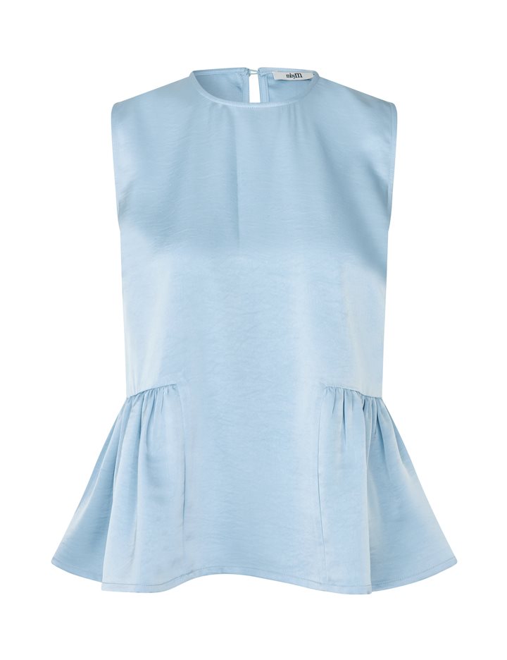 Satin top with peplum.- Material: 98% Polyester, 2% Elastane- Sleeveless- Peplum at the bottom- Button closure at the back- Loose fit- Satin