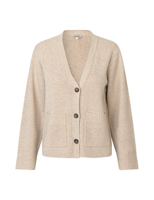 Knitted cardigan with large pockets- Material: 35% Nylon, 33% Wool, 32% Acrylic- Long sleeves with ribbed trim- Ribbed hems- Two pockets on the front- Button closure- Normal length