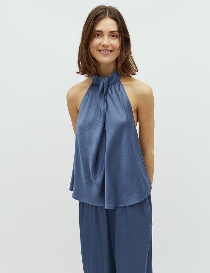 Top with knot detail at the neck.- Material: 54% Polyester, 46% Viscose- Without sleeves- Loose fit- Knot detail at the neck- Closes with buttons at the neck- Low back- Normal length- Satin qualityThe height of the model is 175 cm and she is wearing a size S.